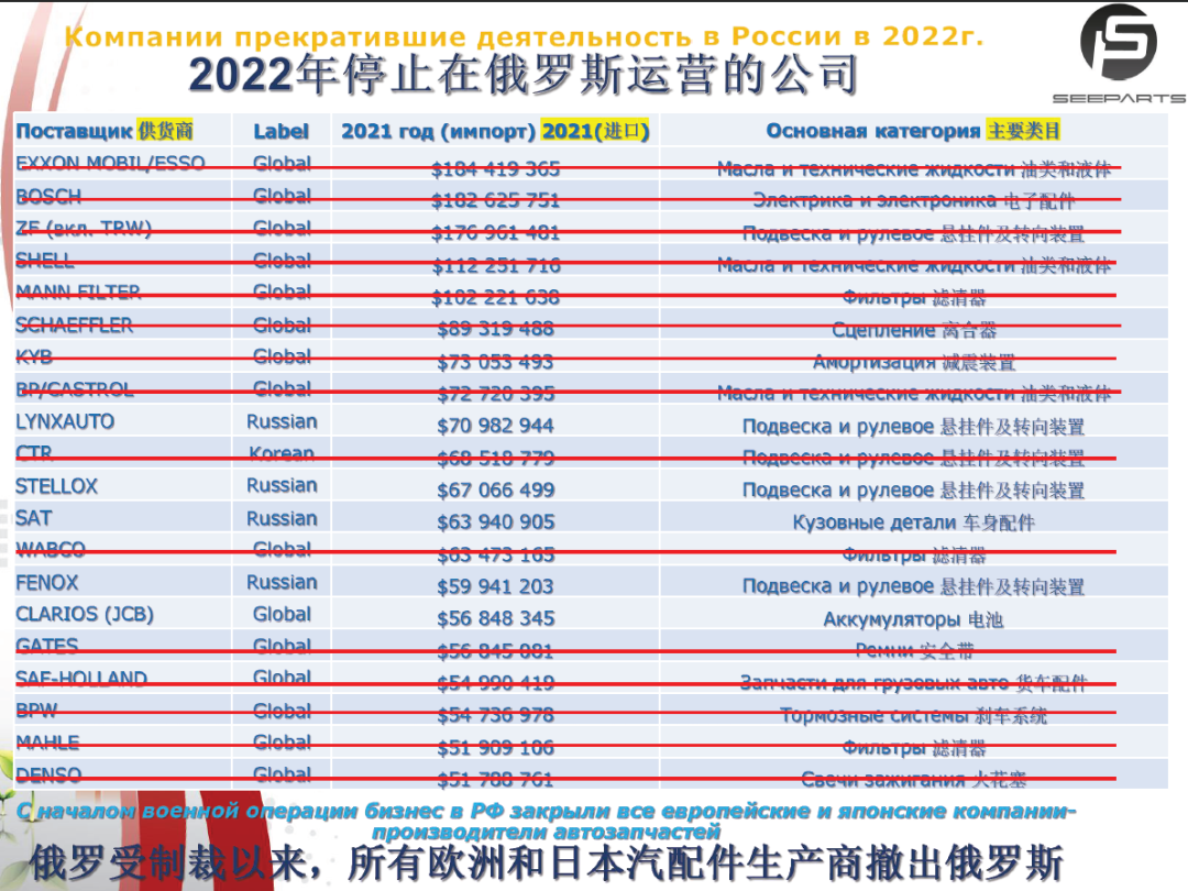 目前,俄羅斯汽車年保有量大約4600萬(wan) 輛,是全球第五大、歐洲第一大汽車市場。俄羅斯每年從(cong) 全球進口汽配產(chan) 品總金額約17億(yi) 美元。近期歐美整車及汽配企業(ye) 撤出俄羅斯市場導致原有供應鏈中斷和整車及汽配產(chan) 品市場短缺、產(chan) 品售價(jia) 大幅上漲(平均漲幅達30%),約有30-35%的維修中心麵臨(lin) 配件困境,尤其是發動機、減震器、懸架等配件及電子元器件和一些耗材(如機油、濾芯和火花塞)。為(wei) 此,俄羅斯整車經銷和售後服務企業(ye) 正在積極構建新的供應鏈體(ti) 係,尋求通過我會(hui) 同中國企業(ye) 的合作。