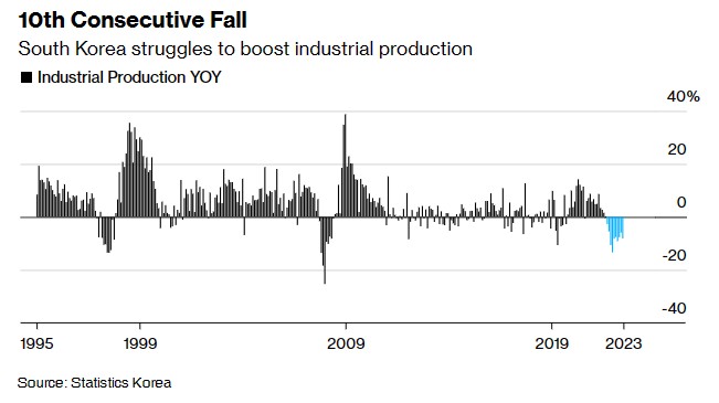 智通財經APP獲悉,韓國7月工業(ye) 產(chan) 出再次下降,創下最長連續下滑的紀錄。在全球經濟增長放緩的背景下,這個(ge) 依賴貿易的國家正在艱難應對出口問題。韓國統計局周四公布的數據顯示,韓國7月工業(ye) 產(chan) 出同比下降8%,降幅高於(yu) 市場預期的5.2%,為(wei) 連續第十個(ge) 月下降,是1976年有記錄以來持續時間最長的一次。