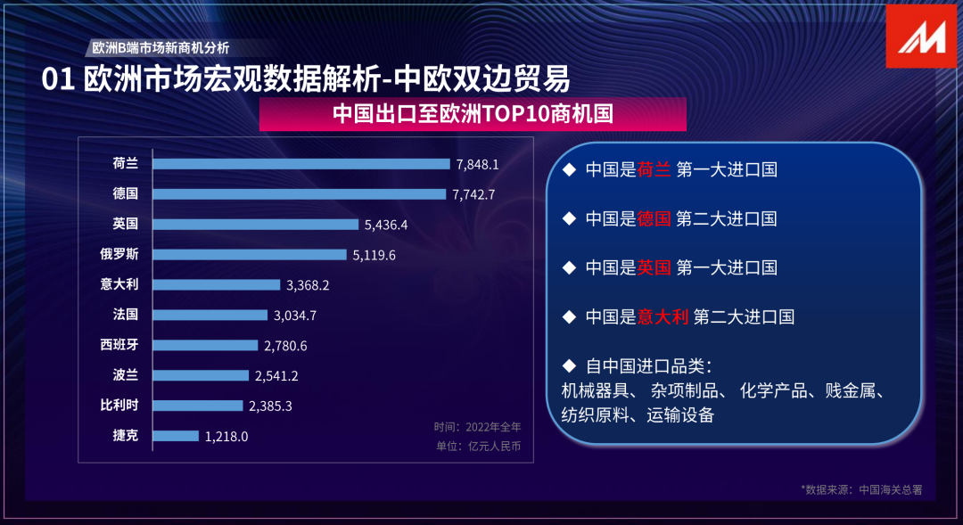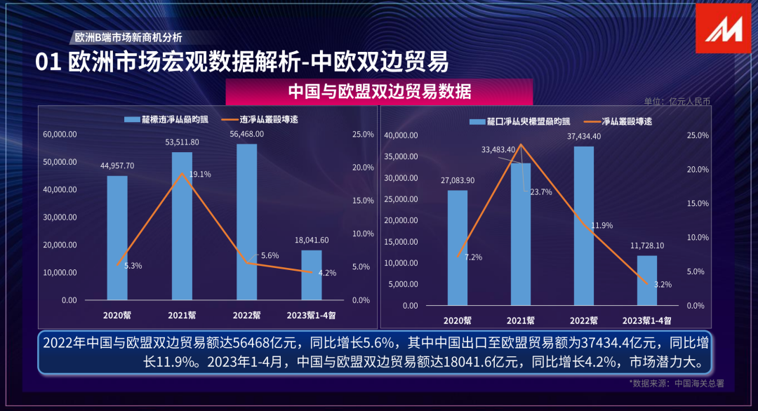 2022年,中歐進出口額為(wei) 8.2萬(wan) 億(yi) 元+人民幣,同比增長8.1%;出口4.9萬(wan) 億(yi) +,同比增長9.8%。