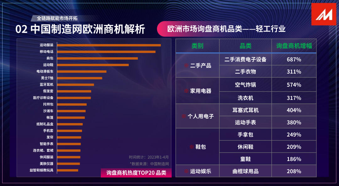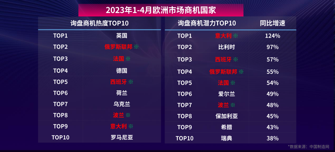商機方麵,根據中國製造網平台數據,1-4月詢盤歐洲市場詢盤商機↓