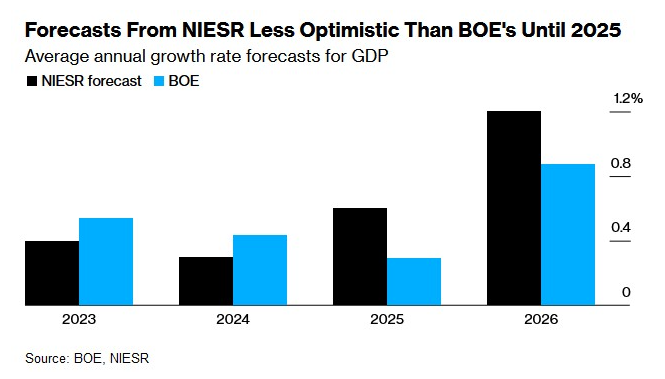 NIESR預測,英國經濟今明兩(liang) 年將分別增長0.4%和0.3%,低於(yu) 英國央行預測的0.5%和0.4%。NIESR還預測,在2024年底前,由於(yu) 麵臨(lin) 技術工人短缺、生產(chan) 率低下、公共投資不足和地區經濟不發達等問題,英國經濟重新陷入衰退的可能性甚至達到60%。
