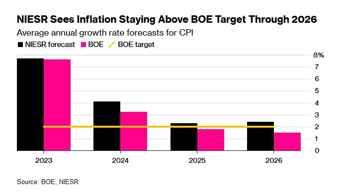 對於(yu) 英國的通脹狀況,NIESR預測,到今年底,整體(ti) 通脹率將從(cong) 目前的7.9%降至5.2%,但此後降幅將放緩,2025年、2026年和2027年的平均通脹率都將略高於(yu) 英國央行2%的目標。