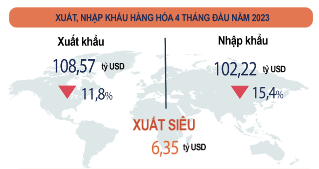 近日,越南國家統計局公布的最新數據顯示,越南4月份出口同比下降17.1%,至275億(yi) 美元;進口同比下降20.5%,至260億(yi) 美元。1-4月出口同比下降11.8%,至1086億(yi) 美元;進口同比下降15.4%,至1022億(yi) 美元。