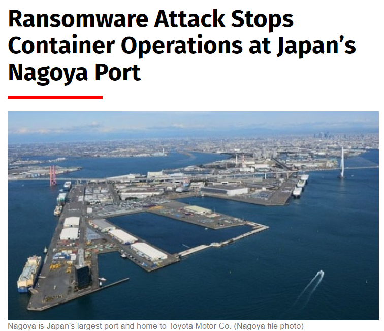 據外媒報道,日本最大港口名古屋港遭受勒索軟件攻擊,集裝箱業(ye) 務暫停。