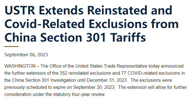 加征關(guan) 稅豁免延長期限為(wei) 3個(ge) 月,由2023年9月30日延至2023年12月31日。