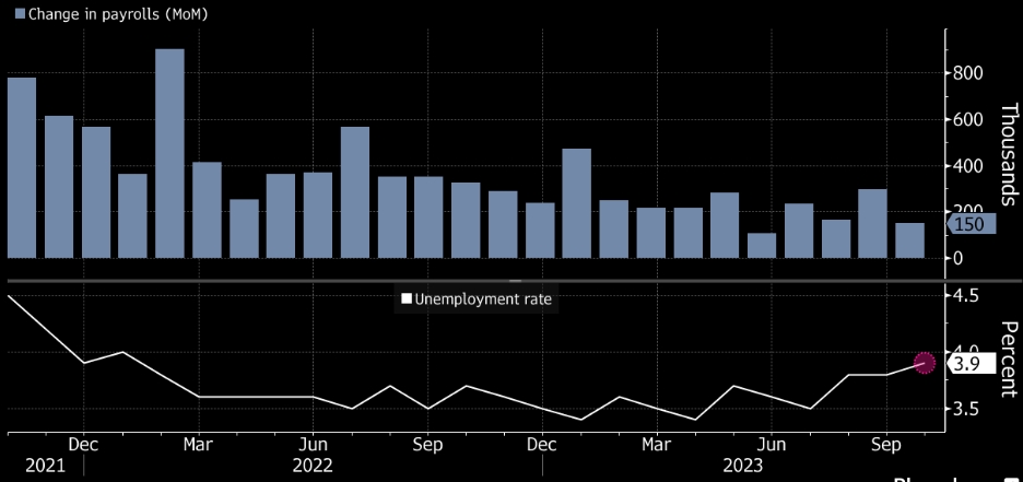 美國10月份就業(ye) 增長放緩程度超預期,失業(ye) 率升至近兩(liang) 年高位3.9%,表明雇主對員工的強勁需求開始降溫。美國勞工統計局周五發布報告顯示,之前兩(liang) 個(ge) 月的數據下修之後,10月份非農(nong) 就業(ye) 人數增加15萬(wan) 。月薪增長放慢。失業(ye) 率的上升表明裁員增加——迄今為(wei) 止雇主們(men) 基本上都避免了裁員。對家庭的調查顯示,失去工作或完成臨(lin) 時工作的人數增加了20萬(wan) 以上。數據公布後,標普500指數走高,美國國債(zhai) 上漲,美元走軟,投資者認為(wei) 美聯儲(chu) 加息結束的可能性上升。交易員下調了未來幾個(ge) 月加息的可能性,並加大了對明年更早降息的押注。醫療保健和社會(hui) 援助以及政府部門推動了就業(ye) 增長。然而其他類別則增長平淡甚至下滑。製造業(ye) 就業(ye) 人數10月份減少3.5萬(wan) ,主要反映了美國汽車工人聯合會(hui) 罷工。