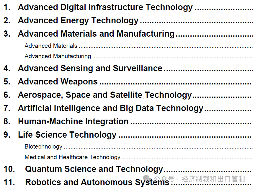 該政策將先進數字基礎設施技術、先進能源技術、先進材料與(yu) 製造、先進傳(chuan) 感和監控、先進武器、航空航天和衛星技術、人工智能與(yu) 大數據技術、人機交互、生命科學技術、量子科學與(yu) 技術、機器人和自主係統等十一個(ge) 領域劃入敏感技術研究範疇清單