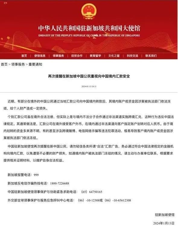 此前中國駐新加坡大使館也一再發文,提醒關(guan) 於(yu) 匯款安全的注意事項。
