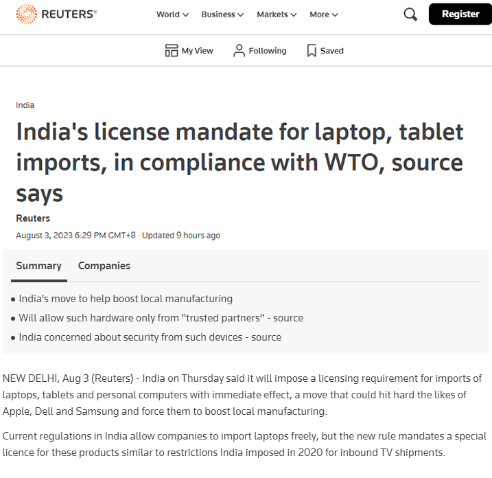 據路透社消息,印度政府8月3日發布公告稱,印度已限製筆記本電腦、平板電腦和個(ge) 人電腦的進口,並立即生效,以推動本地製造業(ye) 的發展。