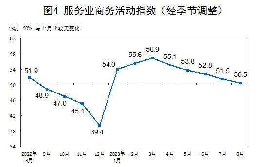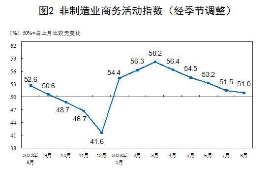 此外,在中國非製造業(ye) 采購經理指數運行情況方麵,8月份,非製造業(ye) 商務活動指數為(wei) 51.0%,比上月下降0.5個(ge) 百分點,仍高於(yu) 臨(lin) 界點,非製造業(ye) 持續擴張。