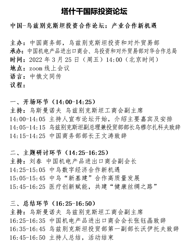 為(wei) 更好地推動雙邊投資合作高質量發展,挖掘合作機遇,打造暢通的合作渠道,中國商務部與(yu) 烏(wu) 茲(zi) 別克斯坦投資和對外貿易部定於(yu) 3月25日在塔什幹國際投資論壇期間舉(ju) 辦“中國-烏(wu) 茲(zi) 別克斯坦投資合作論壇:產(chan) 業(ye) 合作新機遇”。機電商會(hui) 和烏(wu) 投貿部對華合作總局共同承辦。