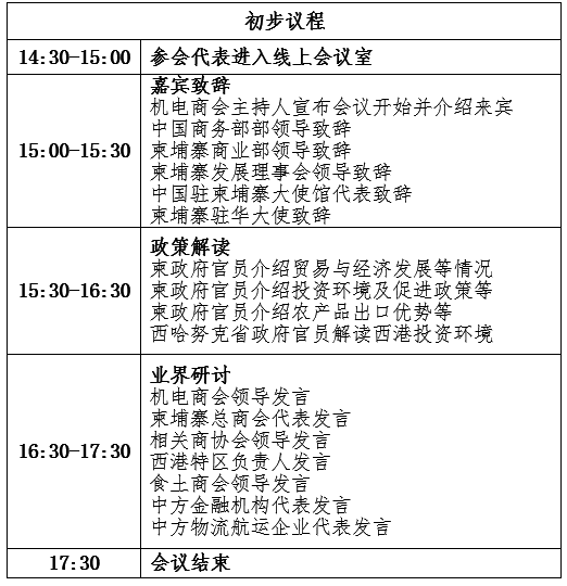 本次論壇以“同享發展機遇,共創區域繁榮”為(wei) 主題。會(hui) 上,兩(liang) 國商務主管部門、雙方使館以及柬埔寨發展理事會(hui) 有關(guan) 領導將分別致辭,柬埔寨相關(guan) 部門官員將分別介紹柬埔寨經貿發展情況、投資政策、產(chan) 品出口優(you) 勢等,中柬工商業(ye) 界代表將分別發言。會(hui) 議將在北京、金邊兩(liang) 地分設會(hui) 場,采取線上線下相結合的方式,北京部分僅(jin) 發言人線下參會(hui) 。會(hui) 議為(wei) 中柬文同傳(chuan) ,初步議程如下: