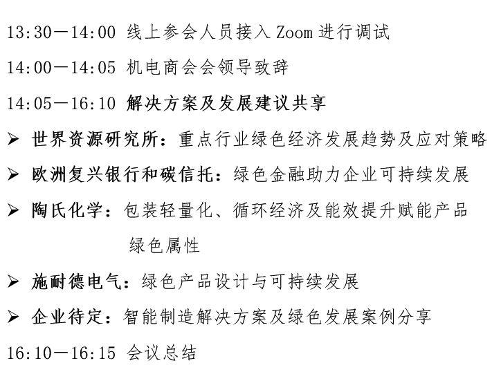 有鑒於(yu) 此,我會(hui) 擬於(yu) 4月28日下午2點舉(ju) 辦出口產(chan) 品綠色發展交流會(hui) 。會(hui) 議將以提升出口產(chan) 品綠色屬性,助力企業(ye) 高質量發展為(wei) 主題,邀請相關(guan) 研究機構、企業(ye) 及金融機構與(yu) 會(hui) ,從(cong) 產(chan) 品綠色產(chan) 業(ye) 鏈供應鏈管理、零碳工廠建設、循環經濟創新、出口融資渠道拓展等角度出發,幫助企業(ye) 認識潛在風險,探討提升產(chan) 品綠色屬性解決(jue) 方案,助力外貿企業(ye) 高質量發展。