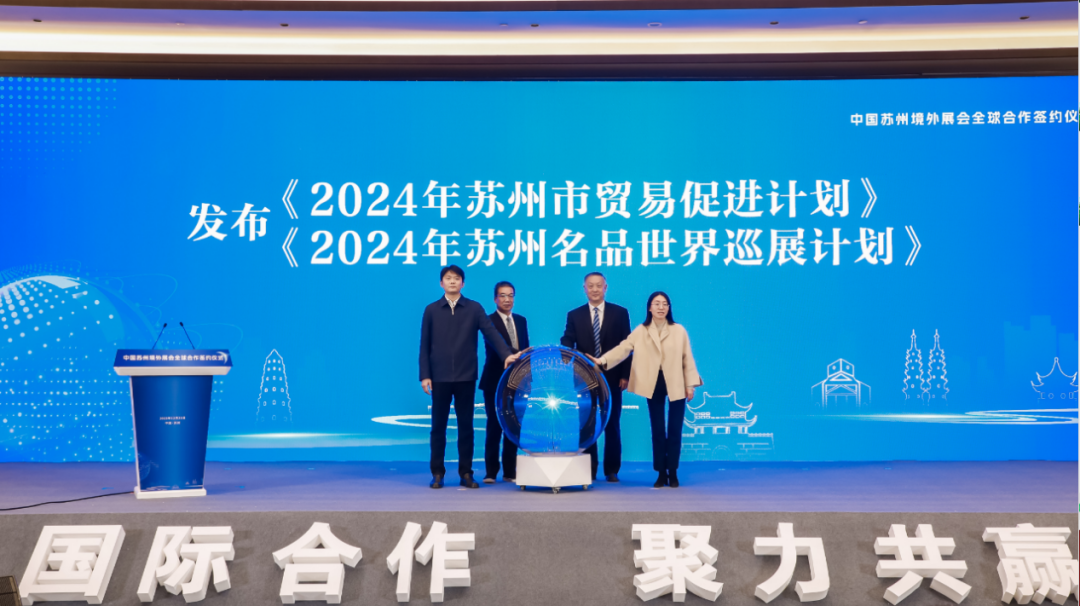 為(wei) 進一步支持企業(ye) 參加境外優(you) 質品牌展會(hui) ,持續鞏固傳(chuan) 統市場訂單,不斷開拓新興(xing) 市場,2023年12月21日下午,蘇州市貿促會(hui) 在蘇州會(hui) 議中心舉(ju) 辦“中國蘇州境外展會(hui) 全球合作簽約儀(yi) 式”。蘇州市委常委、副市長唐曉東(dong) 、各相關(guan) 商協會(hui) 以及國際知名展覽公司、企業(ye) 等近200人參加活動。华体汇体育登陆張鈺晶會(hui) 長受邀出席簽約儀(yi) 式並致辭,與(yu) 蘇州市商務局、蘇州市貿促會(hui) 相關(guan) 領導共同啟動《2024年蘇州市貿易促進計劃》、《2024蘇州名品世界巡展計劃》,並與(yu) 唐曉東(dong) 副市長等領導共同見證各項簽約。