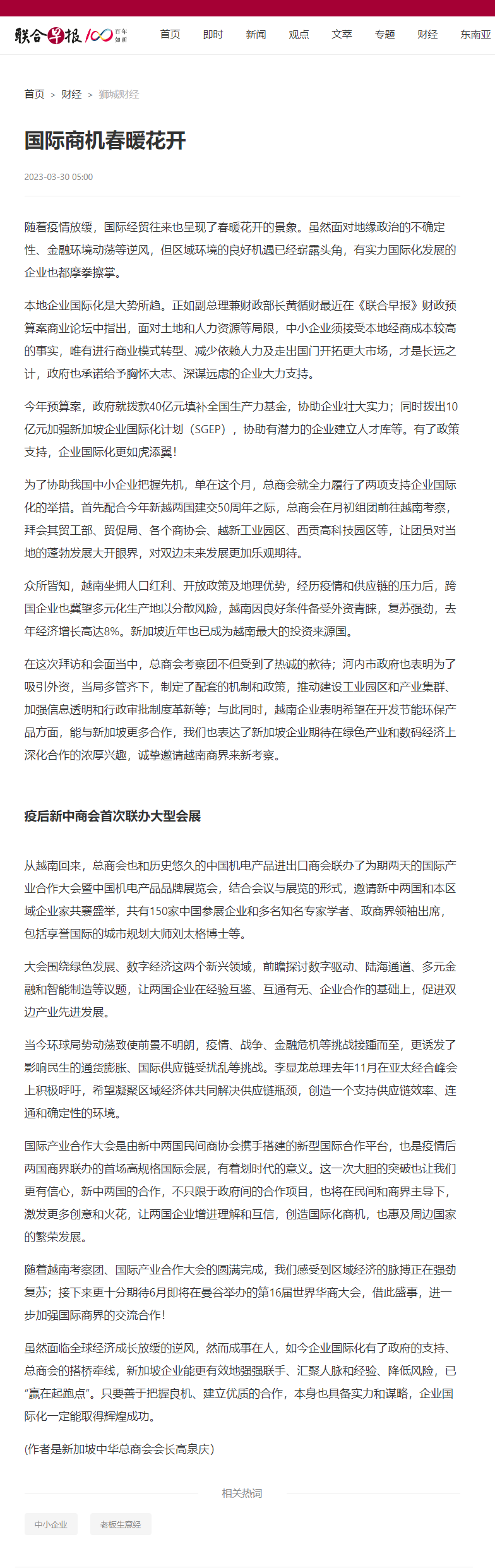 3月30日,新加坡中華總商會(hui) 會(hui) 長高泉慶在《聯合早報》發表署名文章《國際商機春暖花開》,談到國際產(chan) 業(ye) 合作大會(hui) 具有劃時代的意義(yi) 。