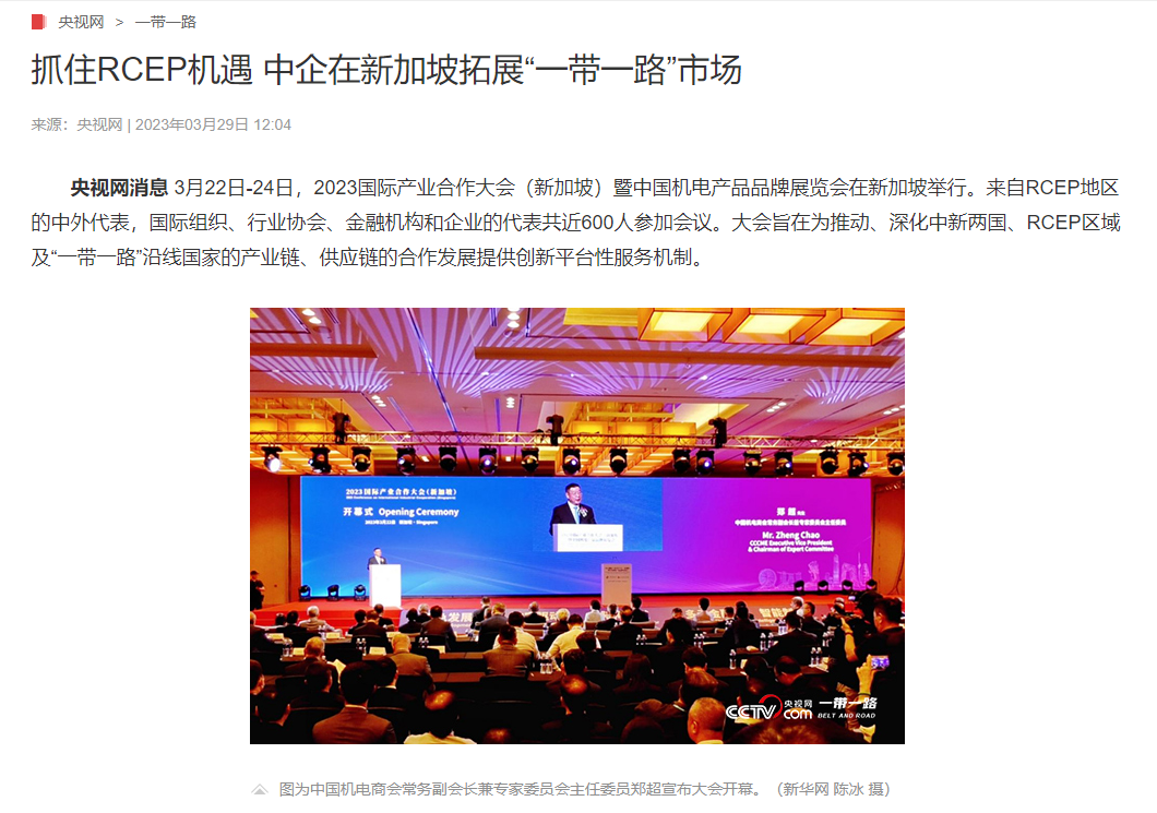 央視網消息 3月22日-24日,2023國際產(chan) 業(ye) 合作大會(hui) (新加坡)暨中國機電產(chan) 品品牌展覽會(hui) 在新加坡舉(ju) 行。來自RCEP地區的中外代表,國際組織、行業(ye) 協會(hui) 、金融機構和企業(ye) 的代表共近600人參加會(hui) 議。大會(hui) 旨在為(wei) 推動、深化中新兩(liang) 國、RCEP區域及“一帶一路”沿線國家的產(chan) 業(ye) 鏈、供應鏈的合作發展提供創新平台性服務機製。