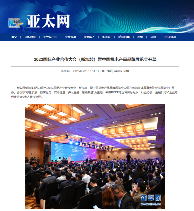 ✦ 新華網:2023國際產(chan) 業(ye) 合作大會(hui) (新加坡)暨中國機電產(chan) 品品牌展覽會(hui) 開幕