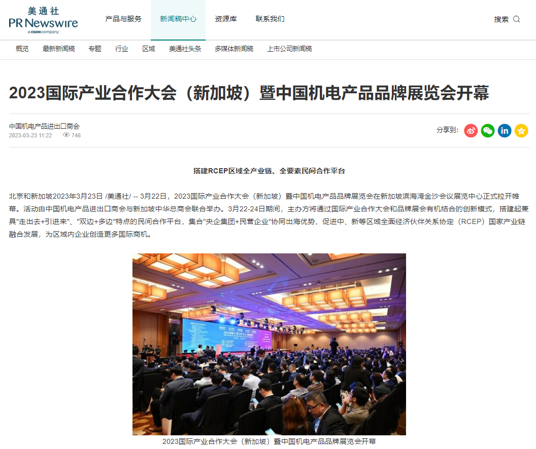 ✦ 美通社:2023國際產(chan) 業(ye) 合作大會(hui) (新加坡)暨中國機電產(chan) 品品牌展覽會(hui) 開幕 搭建RCEP區域全產(chan) 業(ye) 鏈、全要素民間合作平台