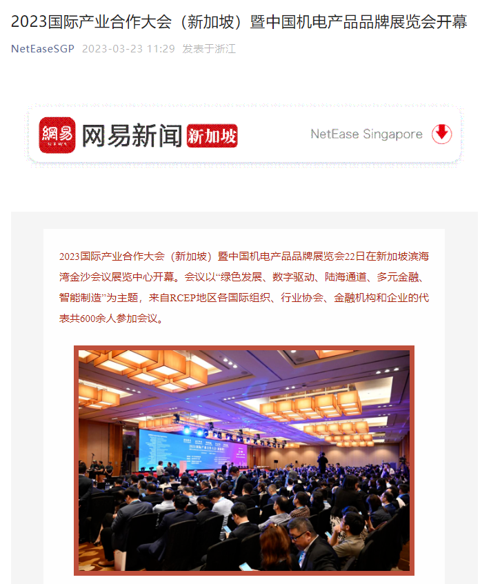 ✦ 網易(新加坡):2023國際產(chan) 業(ye) 合作大會(hui) (新加坡)暨中國機電產(chan) 品品牌展覽會(hui) 開幕