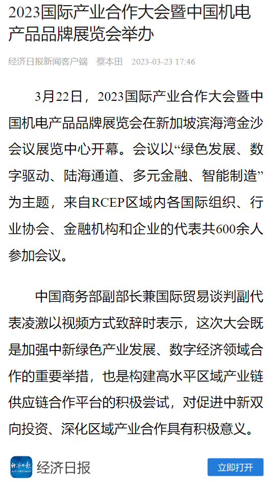 北京日報:搭建RCEP區域全產(chan) 業(ye) 鏈、全要素民間合作平台—— 2023國際產(chan) 業(ye) 合作大會(hui) (新加坡)暨中國機電產(chan) 品品牌展覽會(hui) 開幕