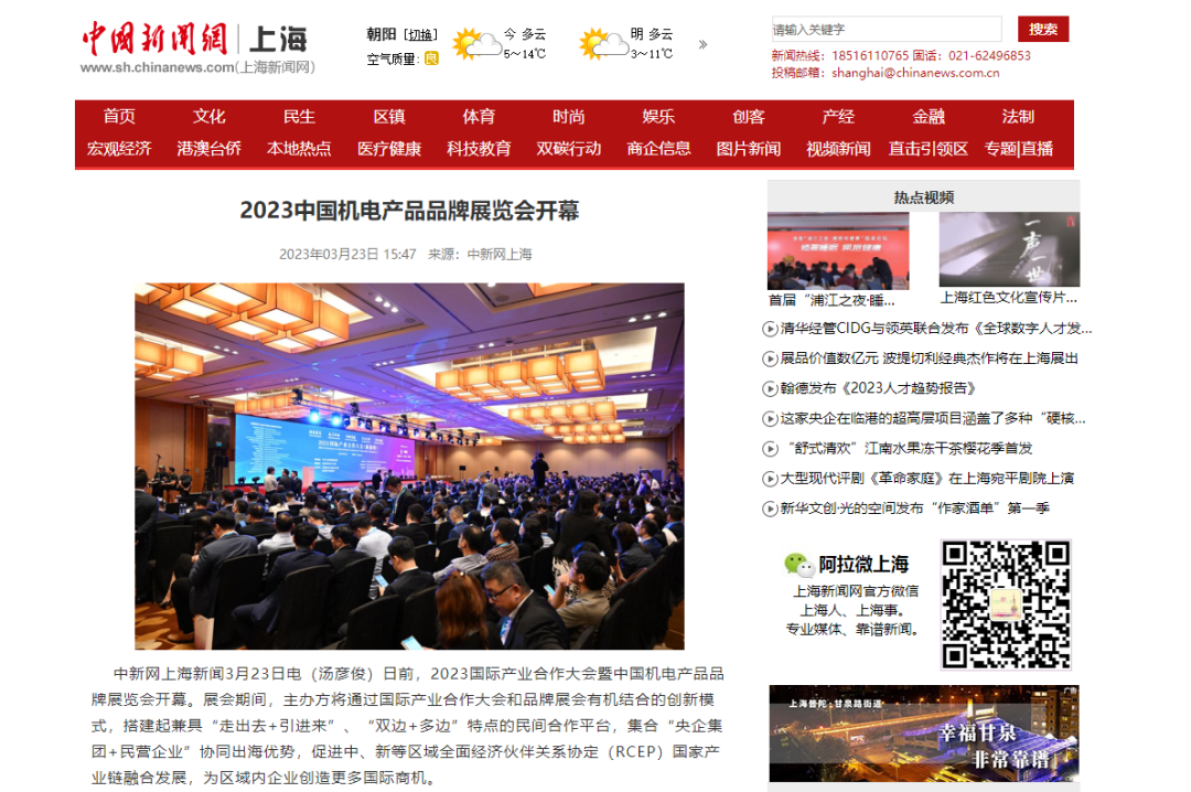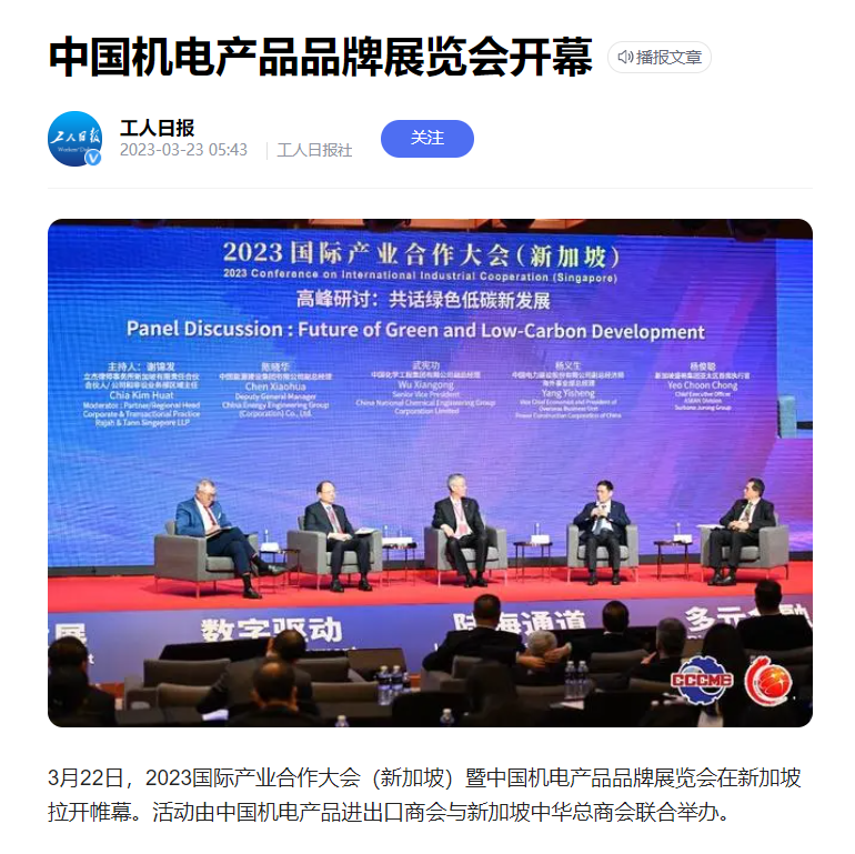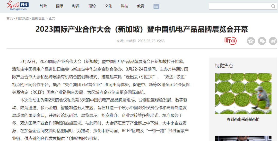 ✦ 光明網:2023國際產(chan) 業(ye) 合作大會(hui) (新加坡)暨中國機電產(chan) 品品牌展覽會(hui) 開幕