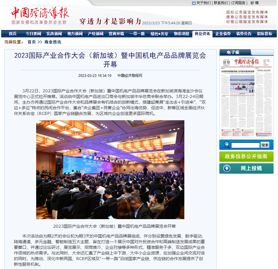 ✦ 中國經濟導報:2023國際產(chan) 業(ye) 合作大會(hui) (新加坡)暨中國機電產(chan) 品品牌展覽會(hui) 開幕