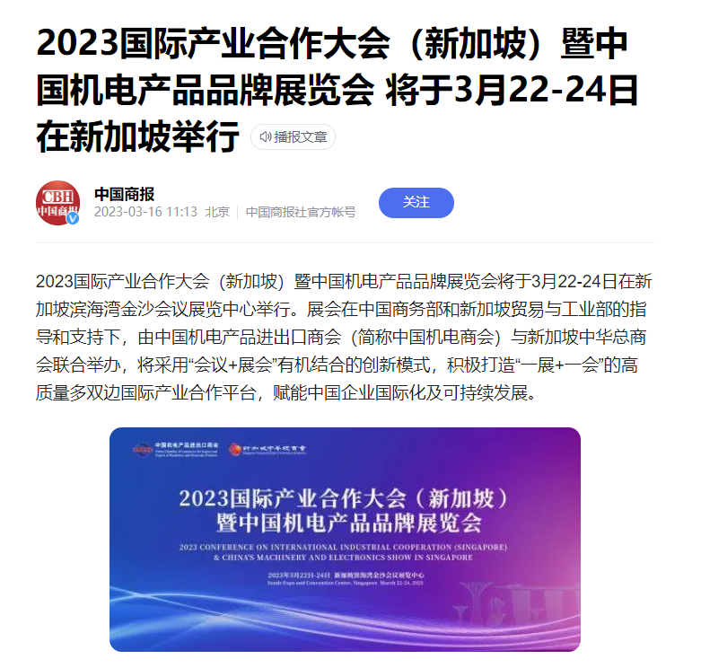 ✦ 中國商報:2023國際產(chan) 業(ye) 合作大會(hui) (新加坡)暨中國機電產(chan) 品品牌展覽會(hui) 將於(yu) 3月22-24日在新加坡舉(ju) 行