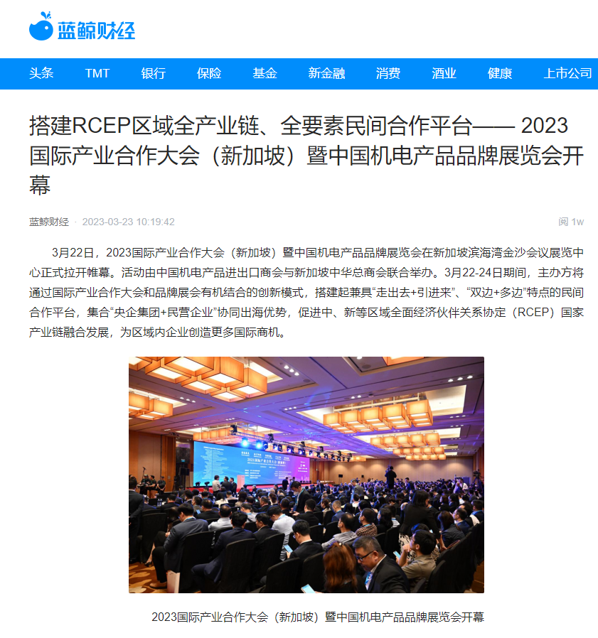 ✦ 藍鯨財經:搭建RCEP區域全產(chan) 業(ye) 鏈、全要素民間合作平台—— 2023國際產(chan) 業(ye) 合作大會(hui) (新加坡)暨中國機電產(chan) 品品牌展覽會(hui) 開幕