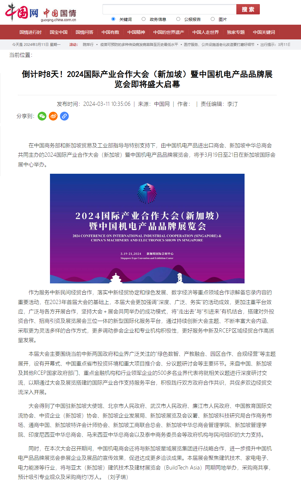 中國網 | 倒計時8天!2024國際產業合作大會(新加坡)暨中國機電產品品牌展覽會即將盛大啟幕