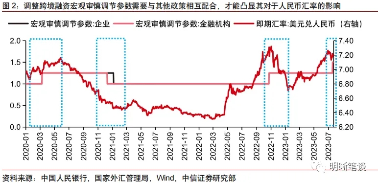回溯曆史,調整跨境融資宏觀審慎調節參數往往需要與(yu) 其他政策相互配合,才能更好地凸顯其對於(yu) 人民幣匯率的影響。根據中國人民銀行於(yu) 2016年4月發布的《中國人民銀行關(guan) 於(yu) 在全國範圍內(nei) 實施全口徑跨境融資宏觀審慎管理的通知》,企業(ye) 和金融機構開展跨境融資按風險加權計算餘(yu) 額(指已提用未償(chang) 餘(yu) 額),風險加權餘(yu) 額不得超過上限。其中,“跨境融資風險加權餘(yu) 額上限=資本或淨資產(chan) *跨境融資杠杆率*宏觀審慎調節參數”。以此次上調參數為(wei) 例,7月20日,央行和外管局宣布,決(jue) 定將企業(ye) 和金融機構的跨境融資宏觀審慎調節參數從(cong) 1.25上調至1.5。這將推動境內(nei) 主體(ti) 的跨境融資額度增加,或有助於(yu) 跨境資金流入,增加境內(nei) 市場美元流動性,進而緩解人民幣貶值壓力。另一方麵,作為(wei) 央行匯率工具箱的工具之一,調整宏觀審慎調節參數也能夠向市場釋放匯率預期管理信號。從(cong) 市場的曆史表現來看,調整跨境融資宏觀審慎調節參數的信號意義(yi) 或強於(yu) 實際意義(yi) ,其往往需要與(yu) 其他政策相互配合,才能更好地凸顯對人民幣匯率的影響。具體(ti) 來看: