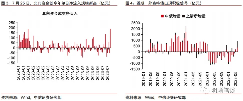 此外,政治局會(hui) 議關(guan) 於(yu) 活躍資本市場、適時調整優(you) 化房地產(chan) 政策等方麵的積極表述,同樣對人民幣匯率形成支撐。本輪人民幣匯率走貶的關(guan) 鍵在於(yu) 二季度國內(nei) 經濟基本麵修複不及預期,而此次政治局會(hui) 議提出了部分超出市場預期的政策,考慮到其中部分政策存在想象空間,市場對經濟的悲觀預期可能會(hui) 有所修正,進而有助於(yu) 推動人民幣匯率企穩回升。具體(ti) 來看:一是提出適時調整優(you) 化房地產(chan) 政策、實施一攬子化債(zhai) 方案、將穩就業(ye) 提升到戰略高度等,向市場釋放了積極信號,或在一定程度上改善市場悲觀預期;二是會(hui) 議提出“要活躍資本市場,提振投資者信心”。今年以來,我國金融市場麵臨(lin) 一定的外資流出壓力,且主要集中於(yu) 債(zhai) 市。從(cong) 高頻數據來看,外資持債(zhai) 出現積極信號,6月當月外資淨增持人民幣債(zhai) 券資產(chan) 905.6億(yi) 元,實現連續第二個(ge) 月保持增持狀態。A股市場方麵,7月政治局會(hui) 議召開後的首個(ge) 交易日(7月25日),北向資金實現189.83億(yi) 元的淨買(mai) 入規模,創今年單日淨流入規模新高。基於(yu) 本次政治局會(hui) 議的部署,未來資本市場基礎製度有望進一步完善,或在吸引中長期資金入市、加大對外開放力度等方麵有所作為(wei) ,股債(zhai) 市場也料將逐步迎來資本流入。