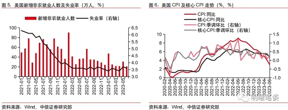美國6月的就業(ye) 和通脹數據均低於(yu) 市場預期,帶動美元指數下行。就業(ye) 方麵,6月美國季調後非農(nong) 就業(ye) 人數增加20.9萬(wan) 人,低於(yu) 預期的23.0萬(wan) 人。就業(ye) 增速回歸此前緩慢下降趨勢,失業(ye) 率小幅回落至3.6%,仍處於(yu) 低位震蕩期。通脹方麵,6月美國CPI以及核心CPI增速均低於(yu) 預期,且CPI同比增速錄得2021年3月以來最低漲幅。在美國就業(ye) 和通脹數據均低於(yu) 市場預期的情況下,美元指數一度跌破100,並帶動離岸美元兌(dui) 人民幣匯率在數據披露當日出現較大跌幅。