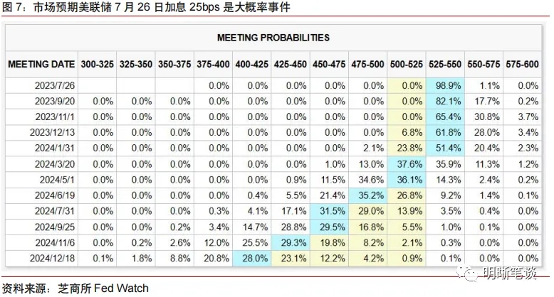 靜待美聯儲(chu) 7月加息靴子落地,人民幣被動貶值壓力趨緩。根據芝商所的Fed Watch工具顯示,截至7月25日,市場預期美聯儲(chu) 7月26日加息25bps是大概率事件,而9月繼續加息的概率偏低。若美聯儲(chu) 加息靴子在7月落地,人民幣匯率所麵臨(lin) 的被動貶值壓力料將趨緩。但值得注意的是,未來美聯儲(chu) 的貨幣政策操作仍依賴於(yu) 8月和9月美國經濟數據指引,同時美聯儲(chu) 官員講話、以及歐洲貨幣政策緊縮節奏和經濟基本麵等因素或仍構成擾動,美元指數短期內(nei) 或偏弱震蕩,但難有明顯下行趨勢。