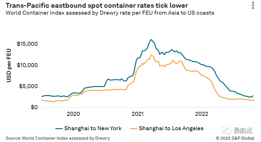 3、與一年前簽署的2022-2023年服務合同相比,由於疫情導致的供應鏈中斷和港口擁堵,被鎖定的運價大幅下降,去年大多數服務合同的美西運價為6000至8000美元/FEU,美東運價為8000至10000美元/FEU。