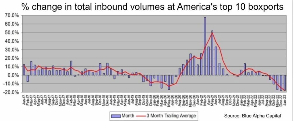 與(yu) 去年1月創紀錄的吞吐量相比,美國10大集裝箱港口1月份的進口量下降了17.9%,經曆了自2008年全球金融危機以來最大的單月跌幅,其中美西港口的降幅最大。
