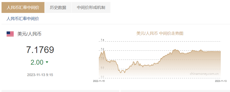 金融界11月13日消息 中國外匯交易中心顯示,13日,人民幣對美元中間價(jia) 報7.1769,調升2個(ge) 基點。