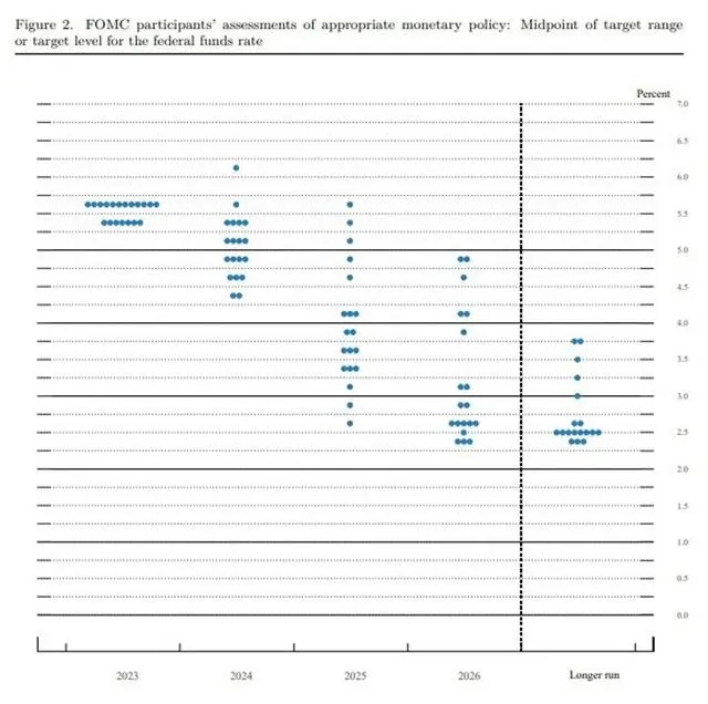 ? ? ? ? ?盡管美聯儲9月暫停加息,但這堪稱一次“鷹派暫停”——最關鍵的是,美聯儲未來利率預測的點陣圖(dot plot)顯示,19名投票委員中有12名成員預計今年還將有1次加息,利率中值預測顯示明年僅會降息2次,而不是上一次會議預測的4次。