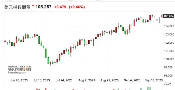 ? ? ? ? ?事實上,在此次美聯儲(chu) 會(hui) 議前夕,10年期美債(zhai) 收益率升至4.36%,再次刷新2007年以來的新高,2年期收益率攀升至5.09%創2006年來新高。盡管本周暫停加息此前已有預見,但市場依舊預期緊縮政策還將延續,推動美元指數周二在105上方小幅走高,三大股指承壓回落。