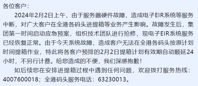 2024年2月2日上午,由於(yu) 服務器硬件故障,造成電子EIR係統等服務中斷,上海港碼頭堆場出現集卡車擁堵情況 , 對在碼頭進提箱等業(ye) 務產(chan) 生影響。
