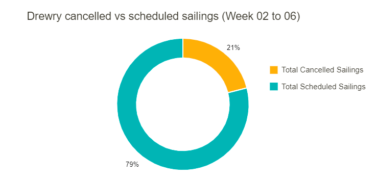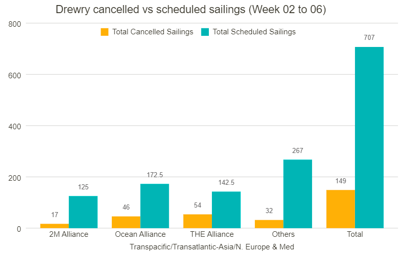 根據德路裏最新數據顯示,在跨太平洋、跨大西洋和亞(ya) 洲至北歐和地中海的主要貿易航線的總共707個(ge) 預定航次中,在第2周(1月9日至15日)到第6周(2月6日至12日)的5周間取消了149個(ge) 航次,取消率占21%。