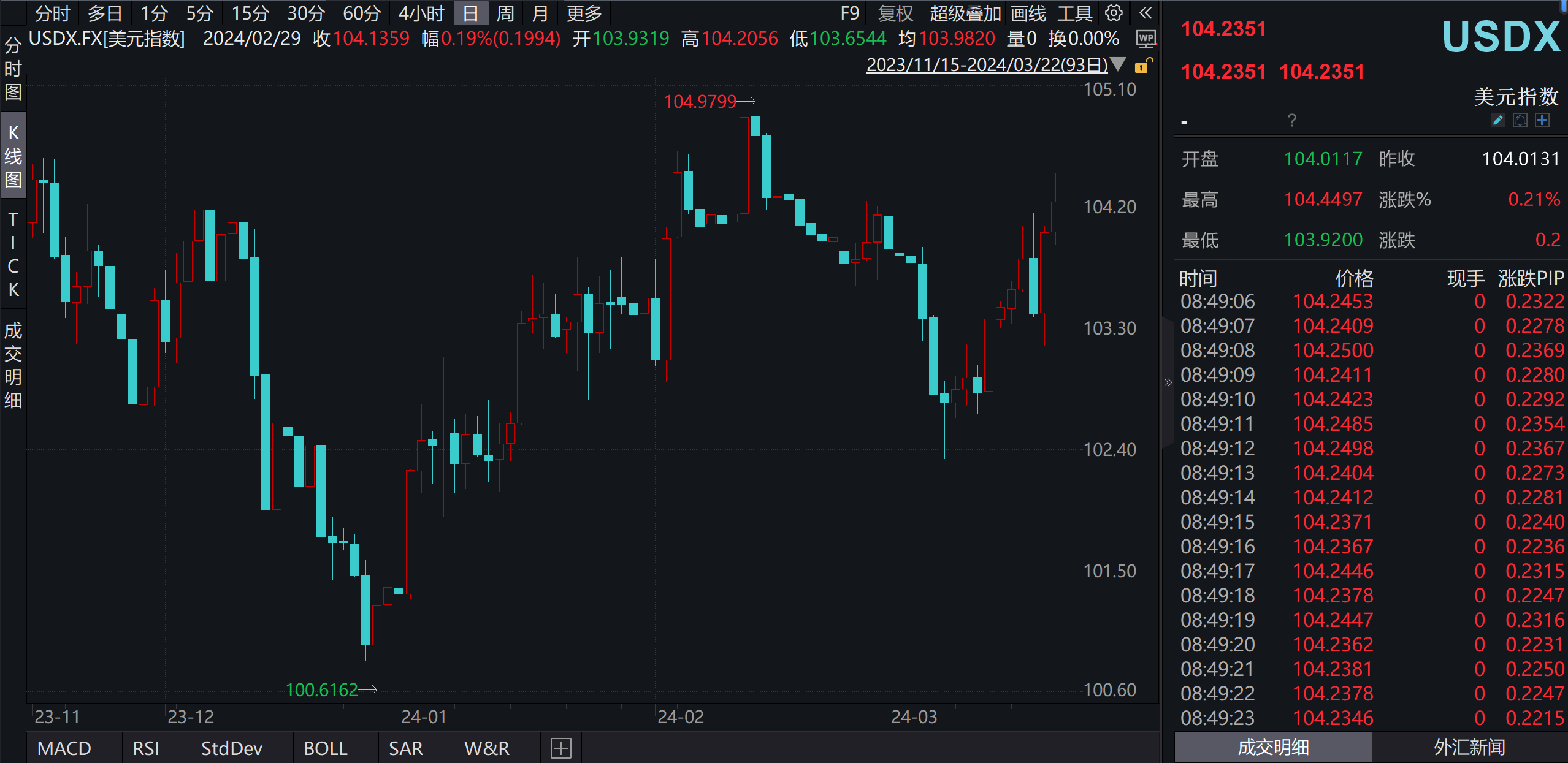 據觀察,美元指數近日持續上升,已從3月8日開盤的102.81,上漲至目前的104.42,今日開盤後一路上升。
