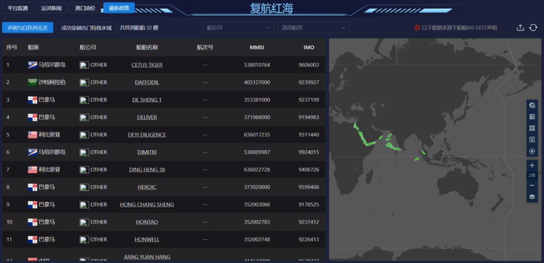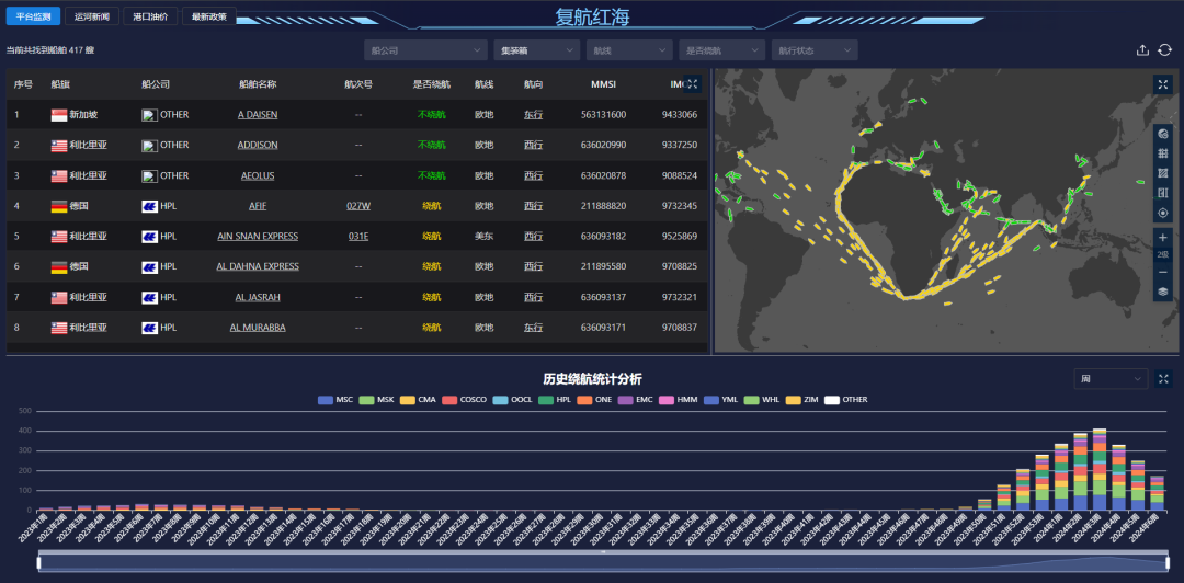 紅海衝(chong) 突伊始,船視寶迅速響應用戶需求,發布上線“複航紅海”、“歐地/美東(dong) 集裝箱繞航監控”、“運河/河口監控”、“全球關(guan) 鍵海峽監控”、“也門特殊水域監控”等多大核心功能