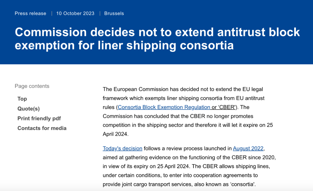 歐盟委員會(hui) 並不質疑班輪公司之間的合作帶來的好處,也認同集運聯營體(ti) 可以改進服務,使客戶受益,但自2009年采用CBER以來,集運業(ye) 的市場發展表明,CBER已不再適用於(yu) 新的市場環境。