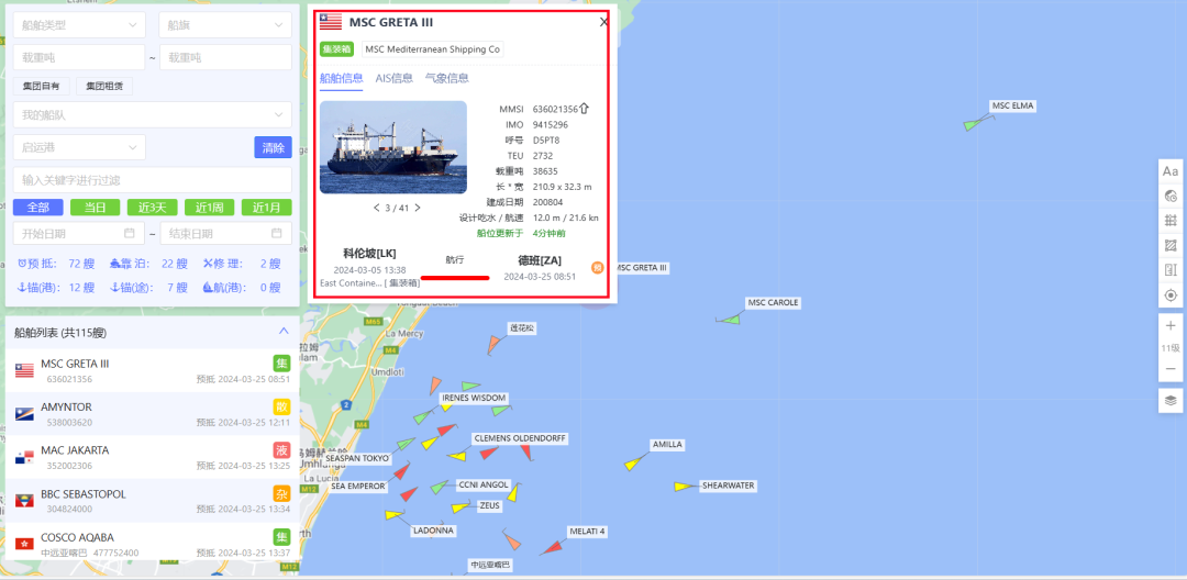 船舶列表有詳細的船舶信息,包含船舶圖片、貨種、AIS信息、當天氣象信息、預抵時間等。