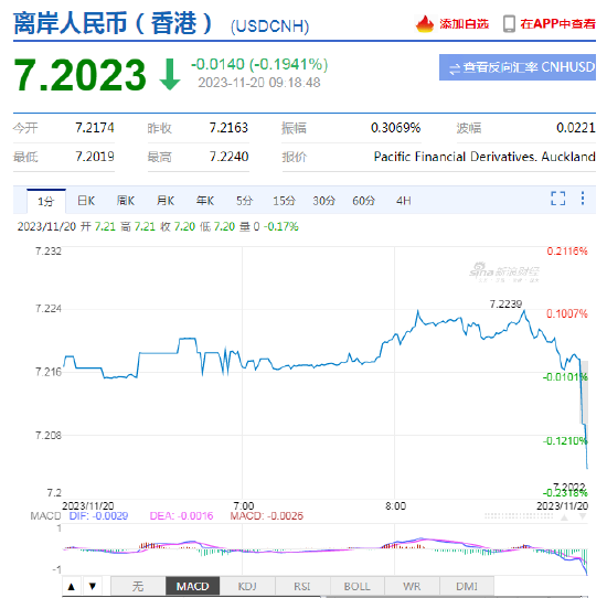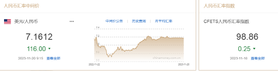 11月20日,(7.1356, 0.0002, 0.00%)中間價(jia) 報7.1612,上調116點,升值至2023年8月11日以來最高,升幅創2023年9月12日以來最大。上一交易日中間價(jia) 報7.1728。離岸人民幣升值逼近7.20。