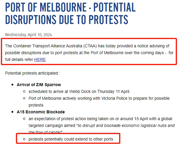 近日,德迅(Kuehne+Nagel)官網發布通知稱,澳大利亞(ya) 集裝箱運輸聯盟(CTAA)警告稱,計劃於(yu) 4月15日星期一在墨爾本港舉(ju) 行的抗議罷工活動將造成港口運營中斷,並可能會(hui) 蔓延到澳大利亞(ya) 其他港口。