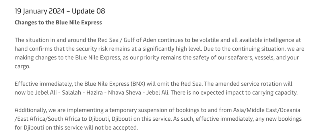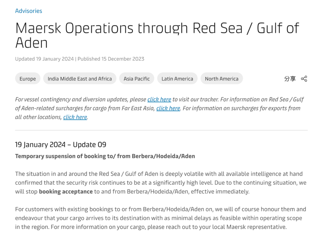 馬士基暫停往返索馬裏柏培拉,也門荷台達、亞(ya) 丁的訂艙,同時,暫停亞(ya) 洲、中東(dong) 、大洋洲、東(dong) 非、南非與(yu) 吉布提之間的訂艙。
