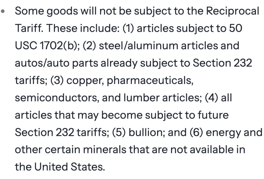 根據白宮發布的行政命令,以下商品將不受“對等關(guan) 稅”約束: