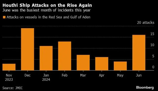 據財聯社報道,統計顯示,也門胡塞武裝6月份在紅海和亞(ya) 丁灣區域對商船發動了2024年迄今為(wei) 止數量最多的襲擊,這顯然再次證明全球海運市場麵臨(lin) 的威脅可能難以迅速化解。