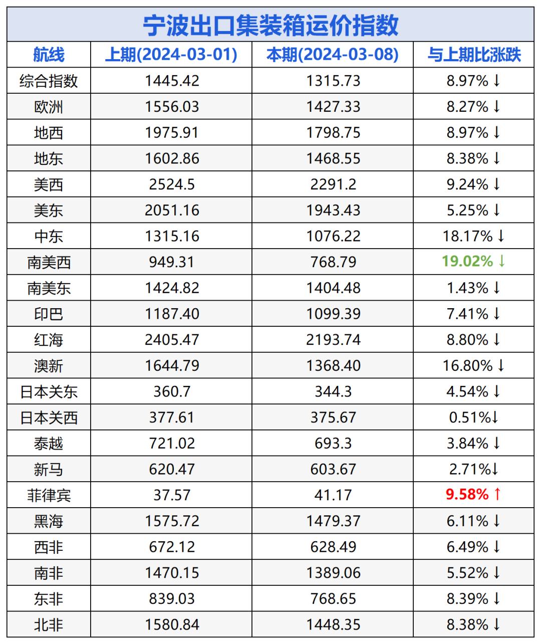 據寧波航運交易所3月8日消息,寧波出口集裝箱運價(jia) 指數(NCFI)報收於(yu) 1315.7點,較前一周下跌9%。